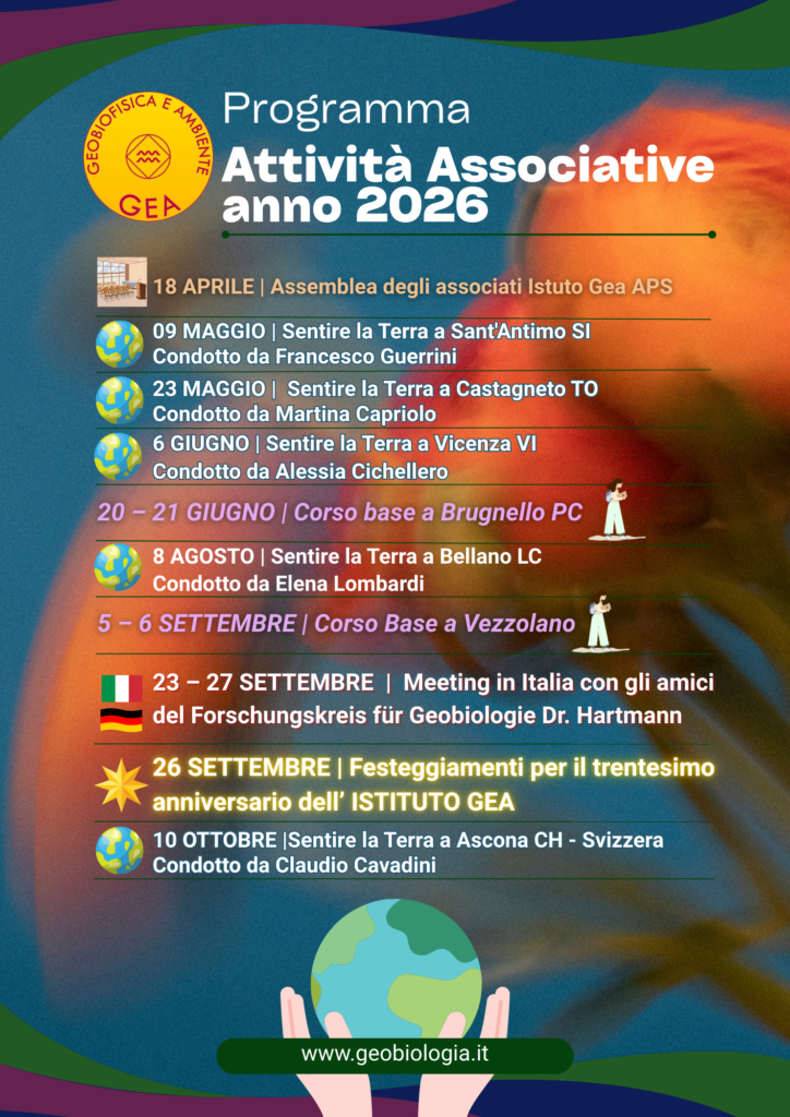 Questo sarà un anno ricco di eventi imperdibili all’insegna della percezione e della conoscenza geobiofisica e geobiologica dell’ambiente che ci circonda. Come Istituto Gea apriremo le nostre attività con seminari Sentire la Terra, condotti dai nostri neo diplomati, in cui si potrà sperimentare un primo approccio di Geologia Percettiva. Continueremo con due Corsi Base, condotti dai nostri docenti e propedeutici alla partecipazione al futuro Corso Avanzato attraverso il quale sarà possibile diventare esperti della materia. Infine festeggeremo i 30 anni della nostra Associazione in concomitanza del meeting con gli amici del Forschungskreis für Geobiologie Dr. Hartmann. Per tutte le info contattaci a gea@geobiologia.it